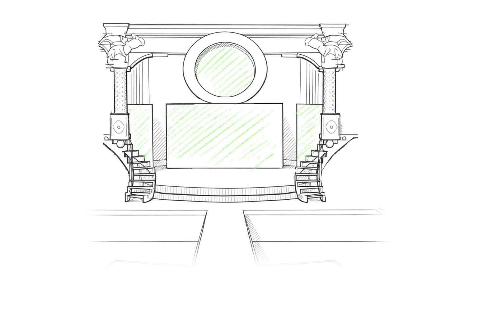 Пространство собрано как комната героини - с акцентом на её характер: мягкость и элегантность. Визуально через мотивы арт-деко. Архитектура уходит в глубину без жёстких границ пространства, поддерживая действие на сцене.